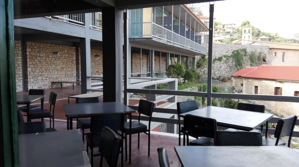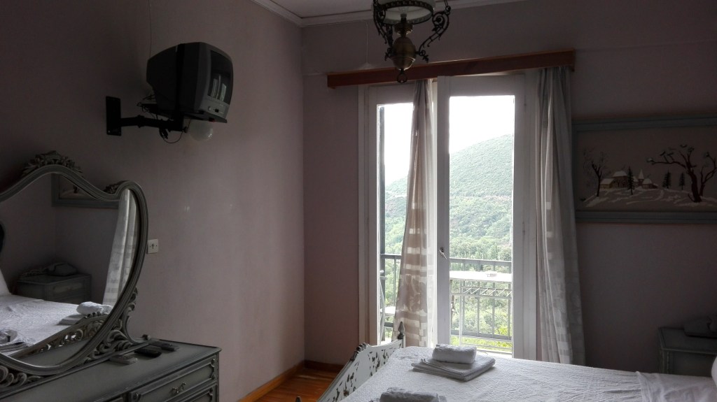 Dla nas było to jeden z najciekawszych hoteli, jakie odwiedziliśmy w Grecji. Niektóre meble faktycznie można by odświeżyć, klamki rzeczywiście były dość luźne, a „barokowa” komoda z lustrem w kształcie serducha, odbijającym pikowane oparcie równie „barokowego” łóżka trochę się gryzła ze wszystkim innym. Ale plusy zdecydowanie przeważyły. Pomijając fakt, że tego typu architektura po prostu nam odpowiada, widok z balkonu naprawdę zapiera dech w piersiach, a zaangażowanie właścicielki w przywracanie hotelowi jego blasku jest godne podziwu i wsparcia.
