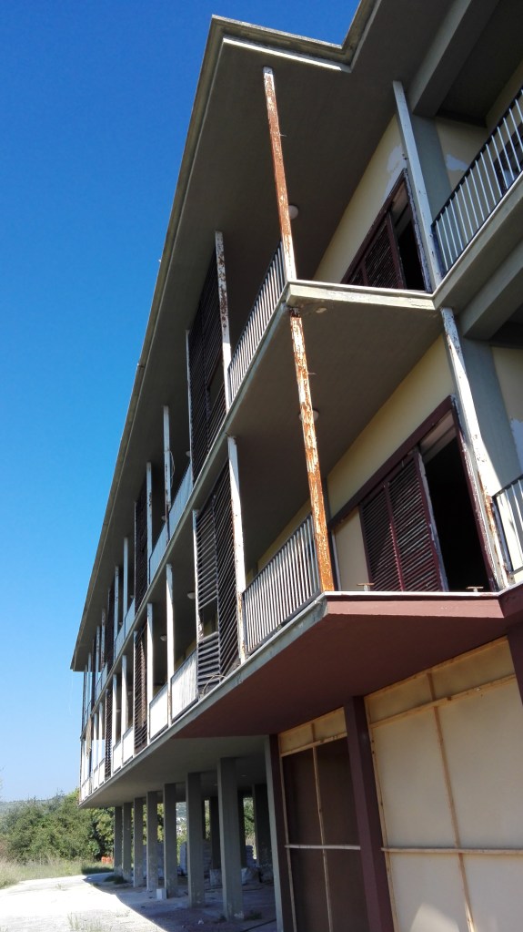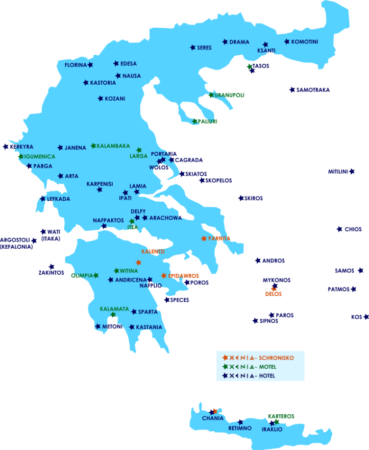 Ksenia (Ξενία) to nazwa projektu budowy hoteli, moteli i schronisk w ramach rządowego programu rozwoju turystyki, finansowanego z pieniędzy przyznanych Grecji w trakcie realizacji Planu Marshalla. Dziś wymienia się 70 takich obiektów, z których 59 powstało między 1954 a 1964 rokiem. Wiele z nich to bardzo zgrabne modernistyczne bryły, usytuowane w pobliżu największych atrakcji turystycznych, często z zapierającym dech w piersiach widokiem. Niestety począwszy od lat 80. ubiegłego wieku sieć przestała sobie radzić z dostosowaniem się do wymogów współczesnego rynku turystycznego. Trochę wstyd. Ponoć dziś w takiej czy innej formie funkcjonuje dwanaście z tych obiektów (liczba do zweryfikowania). Reszta popada w ruinę. My odwiedziliśmy sześć (z czego pięć opuszczonych). Dziś chcielibyśmy się podzielić swoimi wspomnieniami z trzech.