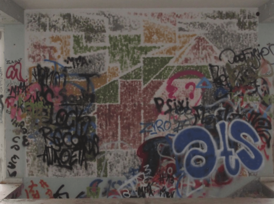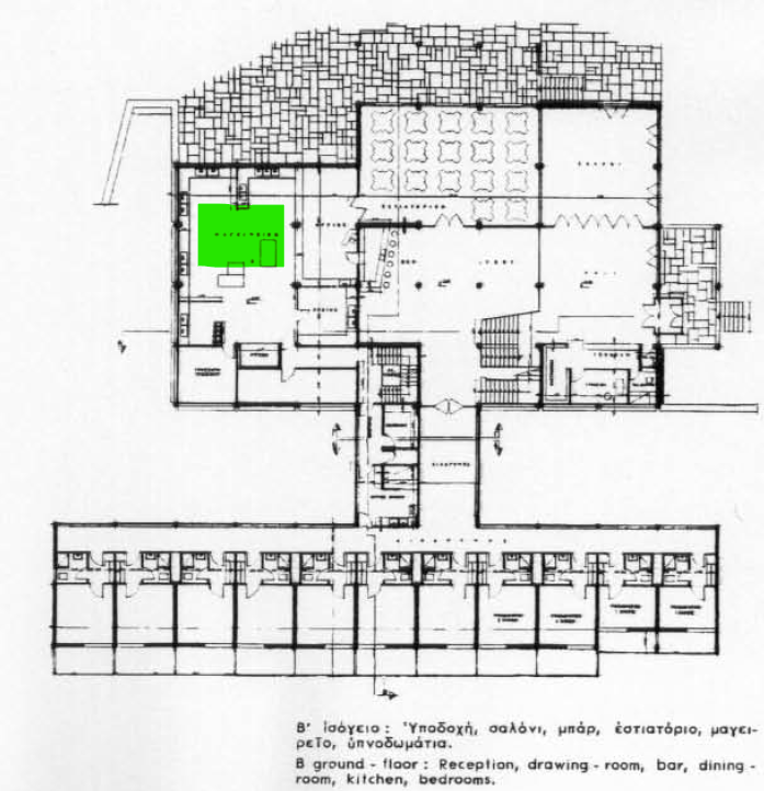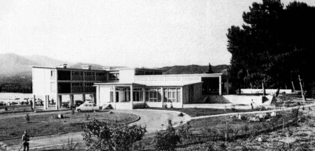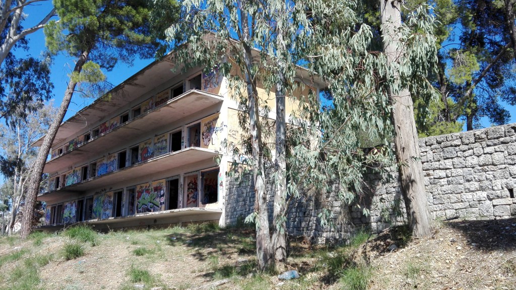 Spartańska Ksenia kategorii A na 60 łóżek powstała w 1958 roku i działała jako hotel do lat 80. XX wieku. Potem jeszcze przez chwilę służyła pomieszczeniami administracji lokalnego szpitala (przeprowadzono nawet w tym celu dodatkowe analizy, mogące być podstawą interwencji modernizacyjnych), a pο 1990 powoli zaczęła popadać w ruinę. Niektóre artykuły donoszą, że przez lata „nieznani sprawcy” ciężarówkami wywozili z budynku elementy wyposażenia. Na szczęście do dziś widać wciąż główne założenia modernistycznej formy, choćby odsłoniętą na zewnątrz konstrukcję nośną z surowego betonu. W 1960 roku Nikos Nikolaou, malarz pokolenia lat 30. XX wieku, na ścianie naprzeciwko recepcji namalował fresk, przypominający obraz „Egina II” z 1958 (kilka zdjęć fresku niżej).